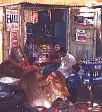 Phone service is fairly reliable in many developing countries, but international service is expensive. This makes it useful for extraordinary situations or emergencies. See our Tips on Telephone page for strategies on getting the best phone service. Internet access has become pervasive in many developing countries, so E-Mail has become the best link home for many situations. Yes, this establishment in Calcutta did have Internet access, and we connected and surfed the Web. We even ate lunch there. And yes, the cow stayed around the entire time. See our recommendations for Connecting to the Internet for more on this topic.